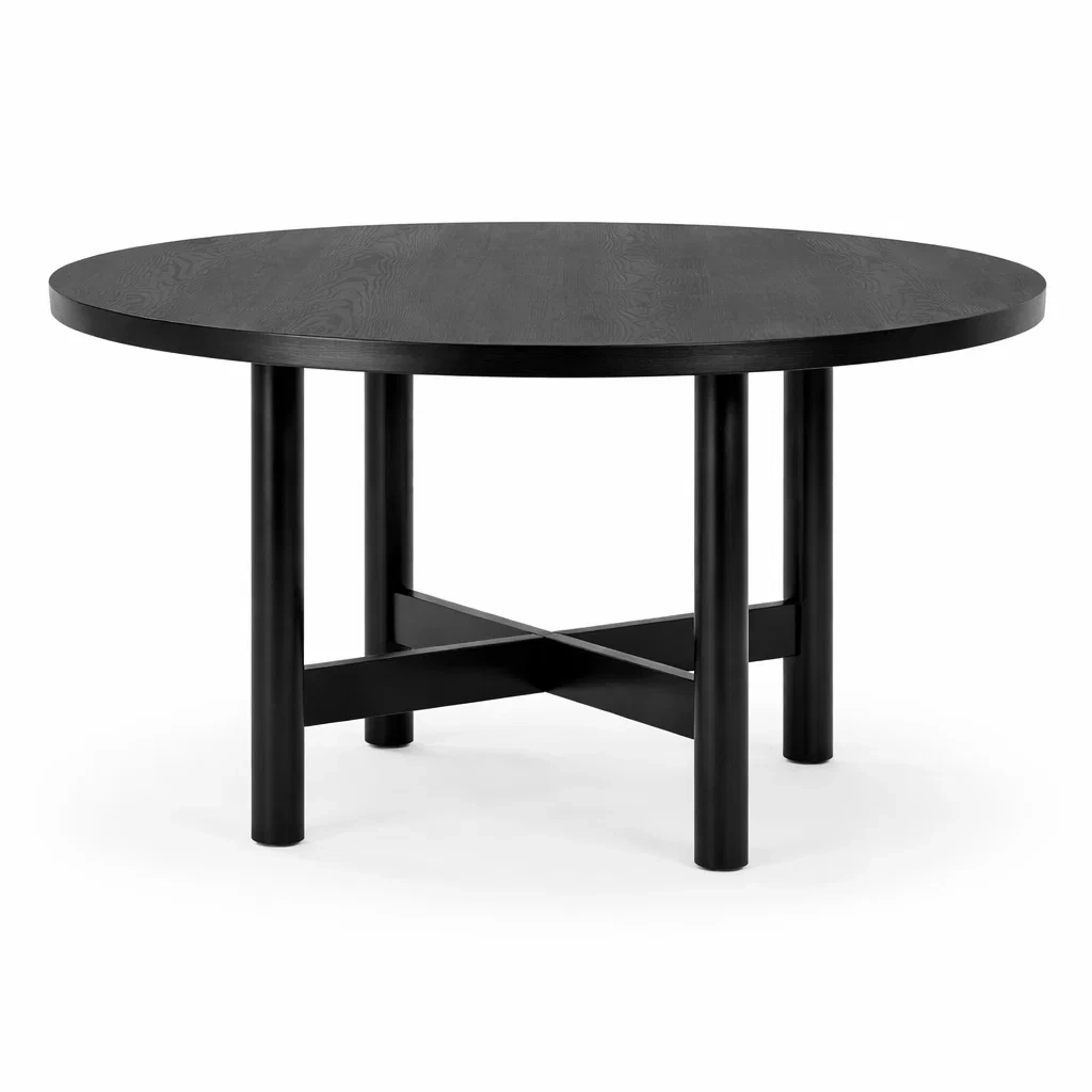 Détails des composants: Plateau en bois massif, pieds cylindriques avec renfort en croix.
