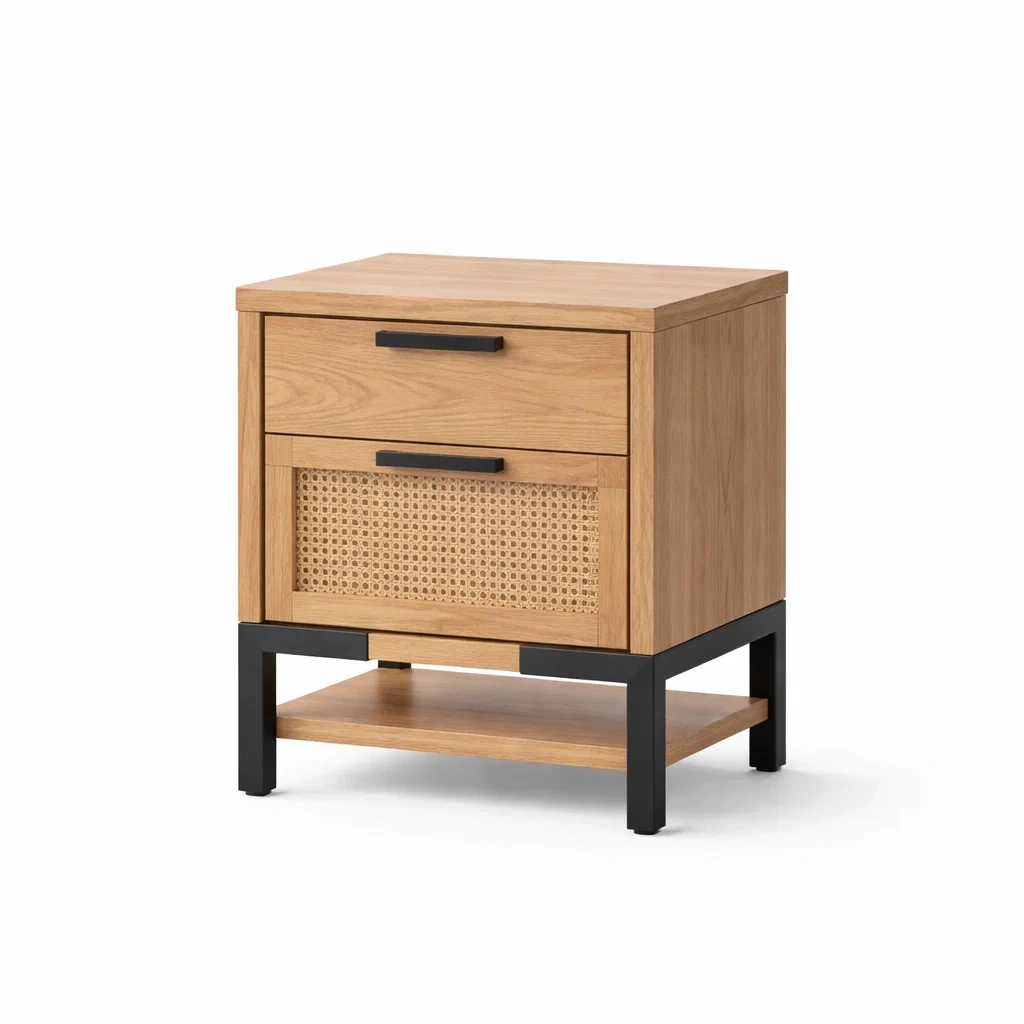 Cette table de chevet est fabriquée avec un corps principal en bois de chêne et une structure en métal avec finition noire. Le panneau de tiroir est en rotin tissé.